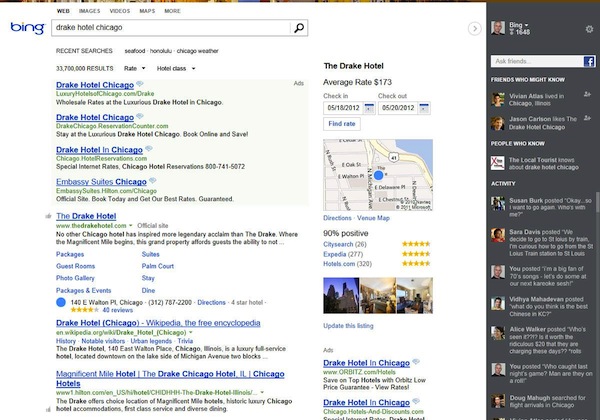 Arama sonuçlarını 3 ayrı sütunda getiren Bing, soldaki ana sütunda asıl web sitesi sonuçlarını getirecek. Ortadaki ‘snapshot’ bölümü ise, aranan bilgi ile ilgili örneğin restoran ya da hotel karneleri hizmetlerine ulaşma imkanı sağlayacak. Bu iki sütuna ek olarak en sağdaki sütunda da aranan kelime ile ilgili Facebook ve diğer sosyal ağlarda yazılan son bilgilere ulaştıracak. (Bir örneğini haberin altında görebilirsiniz)