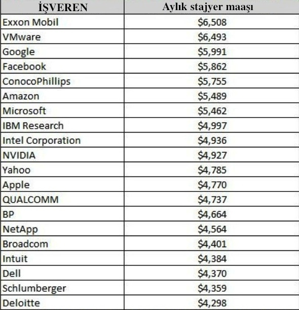İş uzmanları, yazılım mühendislerinin genel olarak stajyer maaşlarının yüksek olduğuna dikkat çekiyor. Örneğin Google, yazılım mühendisi stajyerlerine aylık 5 bin 991 dolar maaş ödüyor. Bu konuda en yüksek rakam ise Exxon Mobil’e ait. Petrol devi yazılım mühendisi stajyerlerine 6 bin 508 dolar aylık ödüyor. Yazılım mühendisi stajyerleri, Amazon’da 5 bin 489 dolar ve Microsoft’ta 5 bin 462 dolar aylık alırken Apple da 4 bin 770 dolar stajyer maaşı var.