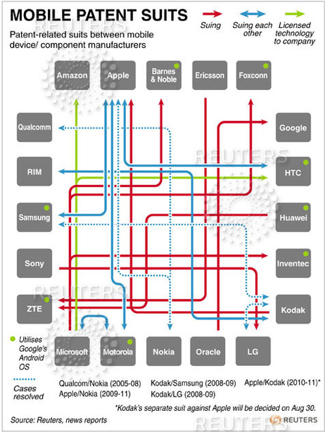 Reuters haber ajansının hazırladığı ve New York metro haritasına benzeyen aşağıdaki grafik, akıllı telefon piyasasındaki dava trafiğini gösteriyor. Google’ın ise başı daha çok Android için yazılım ve sistem üreten firmalar aracılığıyla ağrıyor. Bu firmalar yeşil noktalı olanlar.