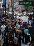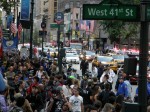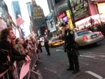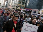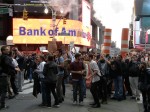 Huge crowd in Times Square. Michael Moore also is here. Lots of cops at 44th and Broadway. Sound of drums, people chanting, ‘show me what democracy looks like, this is what democracy looks like.’ Big media presence. There are people of all ages here — young children on parents’ shoulders, as well as elderly protesters. The ABC banner keeps showing ‘Occupy Wall Street movement goes worldwide,’ much to people’s delight. No violence or altercations with police.