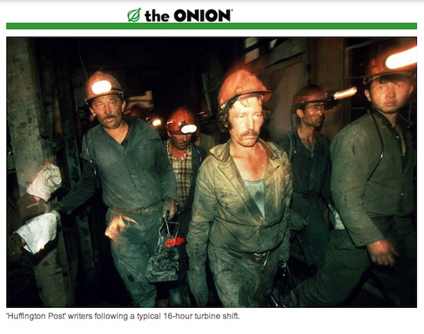 Dünyanın bir numaralı ‘uydurma-satirik haber’ kaynağı The Onion son sayısındaki bir haberiyle Amerikan medya kulislerinde büyük sükse yapıyor. ‘’Huffington Post employee sucked into aggregation turbine (Huffington Post’un dev haber toplama türbünü bir çalışanını yuttu)’’ başlıklı ‘dokundurma’ haber ile, diğer sitelerin ve gazetelerin haberlerini toplayıp yayınlayarak bir ‘’başarı öyküsüne’’ dönüşen Huffington Post’un haber siteciliği tarzına satirik bir eleştiri getiriliyor.