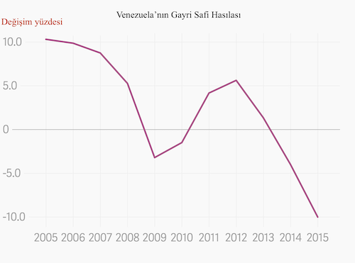 Venezuela’nın gayri safi milli hasılası 2005 yılında beri düzenli bir düşüş eğiliminde. Enflasyonun kontrolden çıkması da Chavez’in son yılında oldu. Tıpkı market raflarından birçok ürünün kaybolmaya başlaması gibi. Maduro ise yangına benzin döktü.