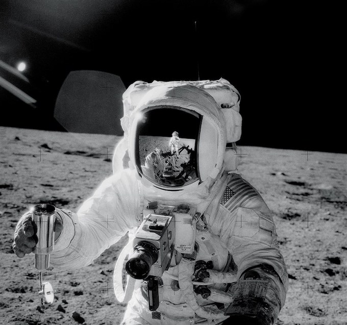 Yukarıdaki fotoğrafta, astronot Alan Bean, ay toprağı doldurduğu küçük bir konteynırı tutarken görülüyor. Fotoğrafı çeken Conrad ise Bean’ın kaskının ön camındaki yansımadan görülebiliyor.
