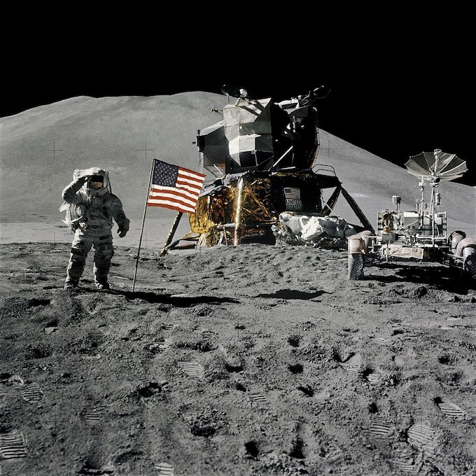 Apollo 15 mürettebatından ay modülü pilotu James Irwin, 1 Ağustos 1971 günü indikleri Ay’da, fotoğrafı çeken arkadaşı David Scott’a askeri selamla poz verirken. Ay modülü ‘Falcon (Doğan)’ fotoğrafın merkezinde. Arkada, Ay düzlüğünden yaklaşık 4 bin metre yükseklikteki Hadley Delta görülüyor.